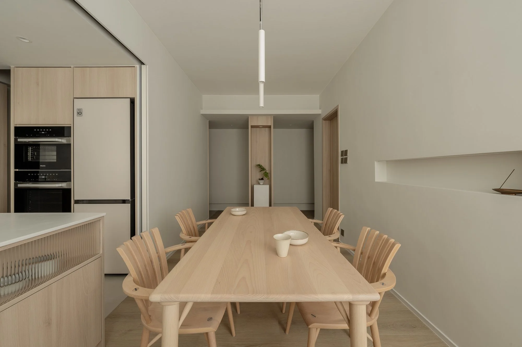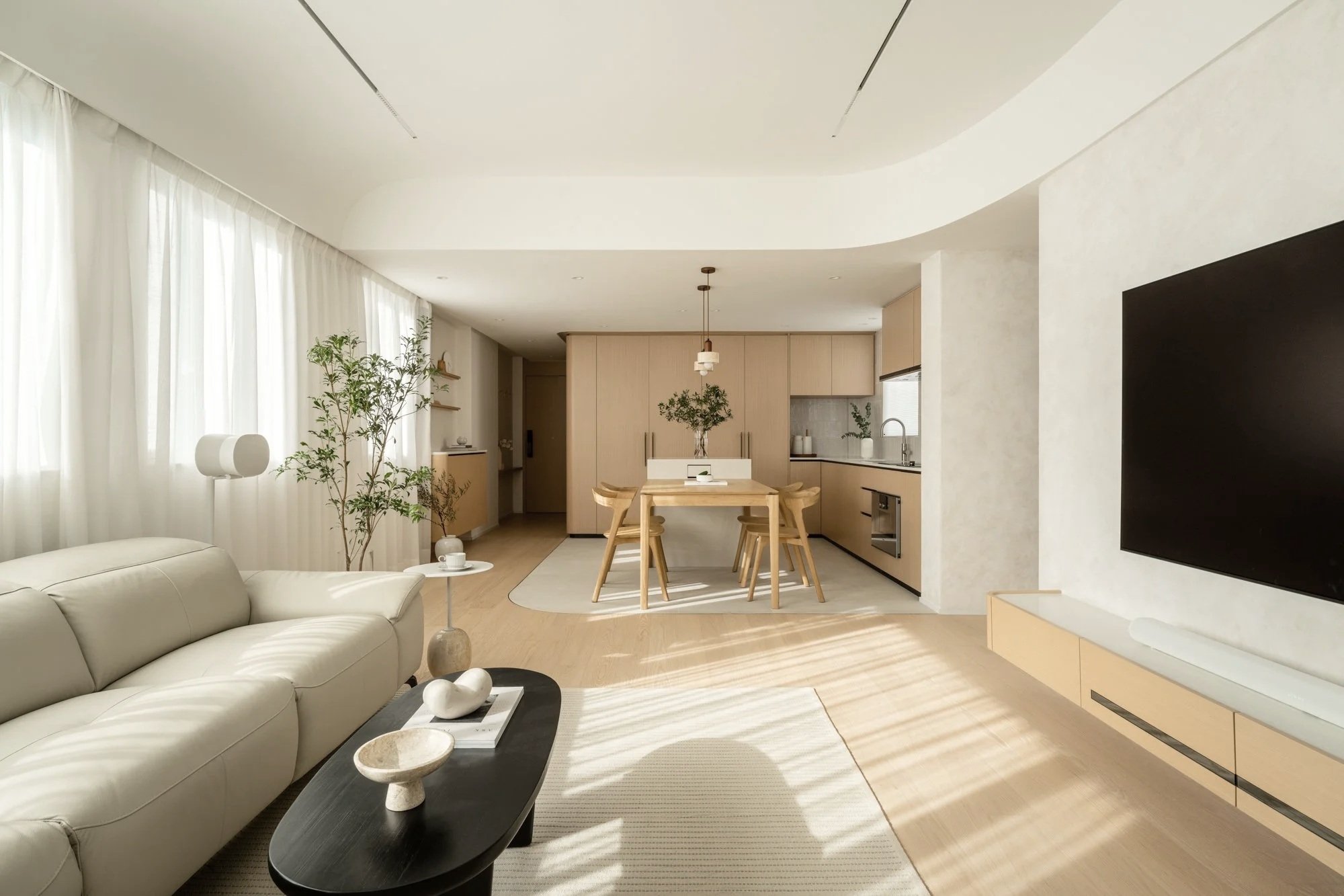 Designed for a multi-generational family, this Japandi-styled apartment enhanced by natural light and a cohesive material palette.