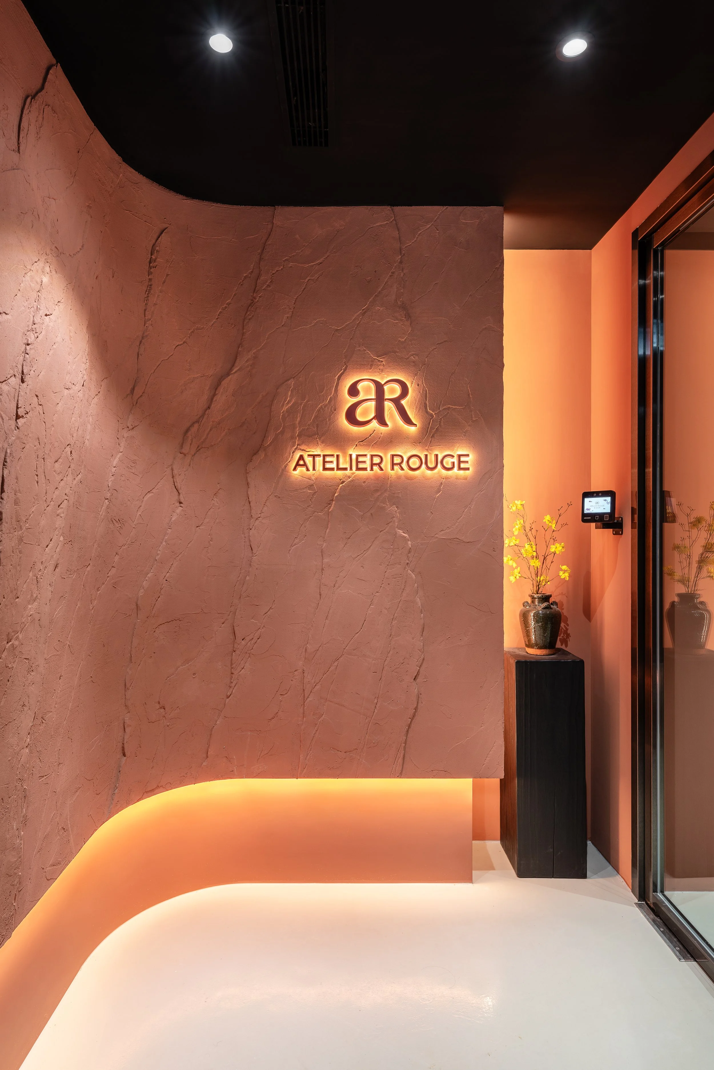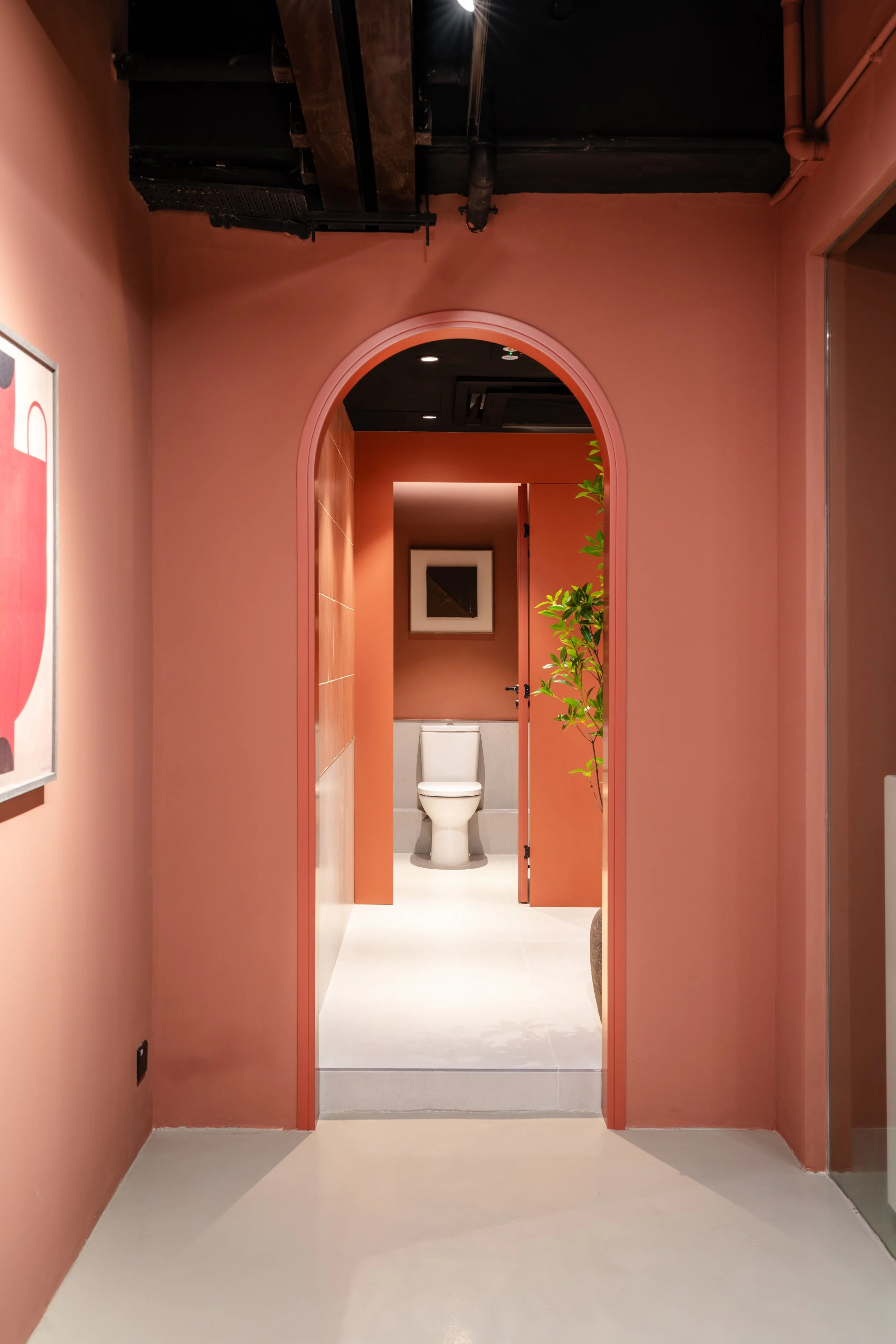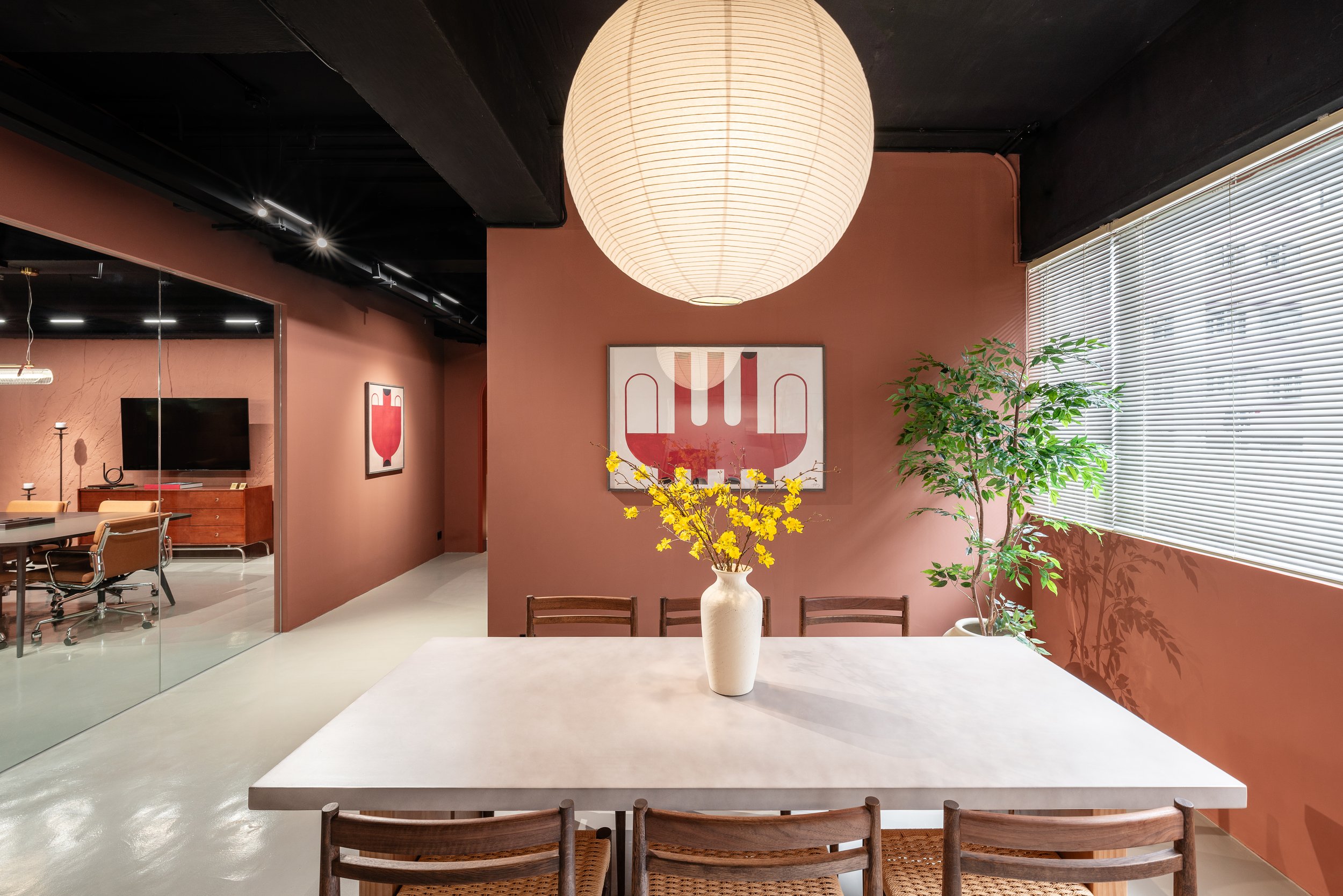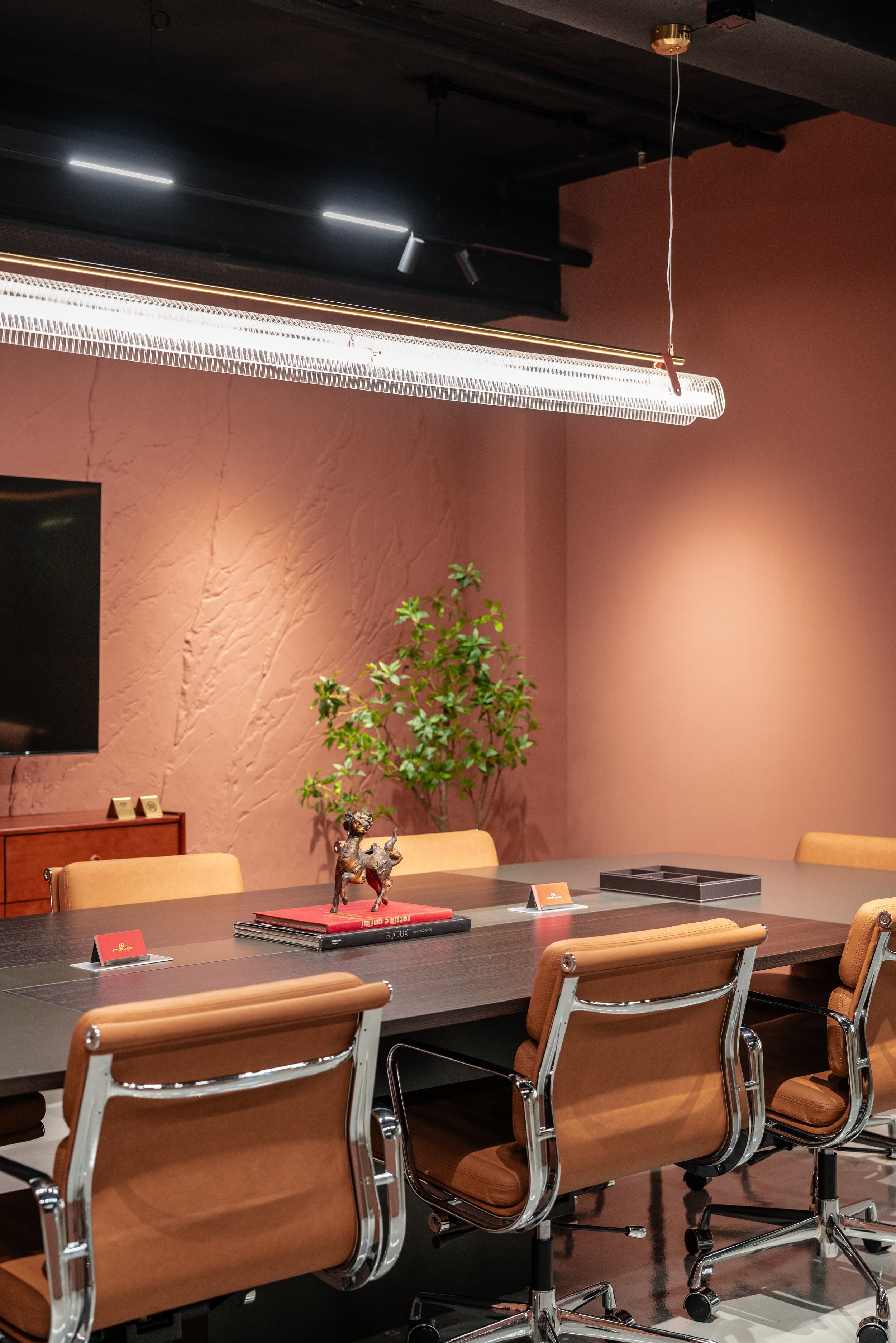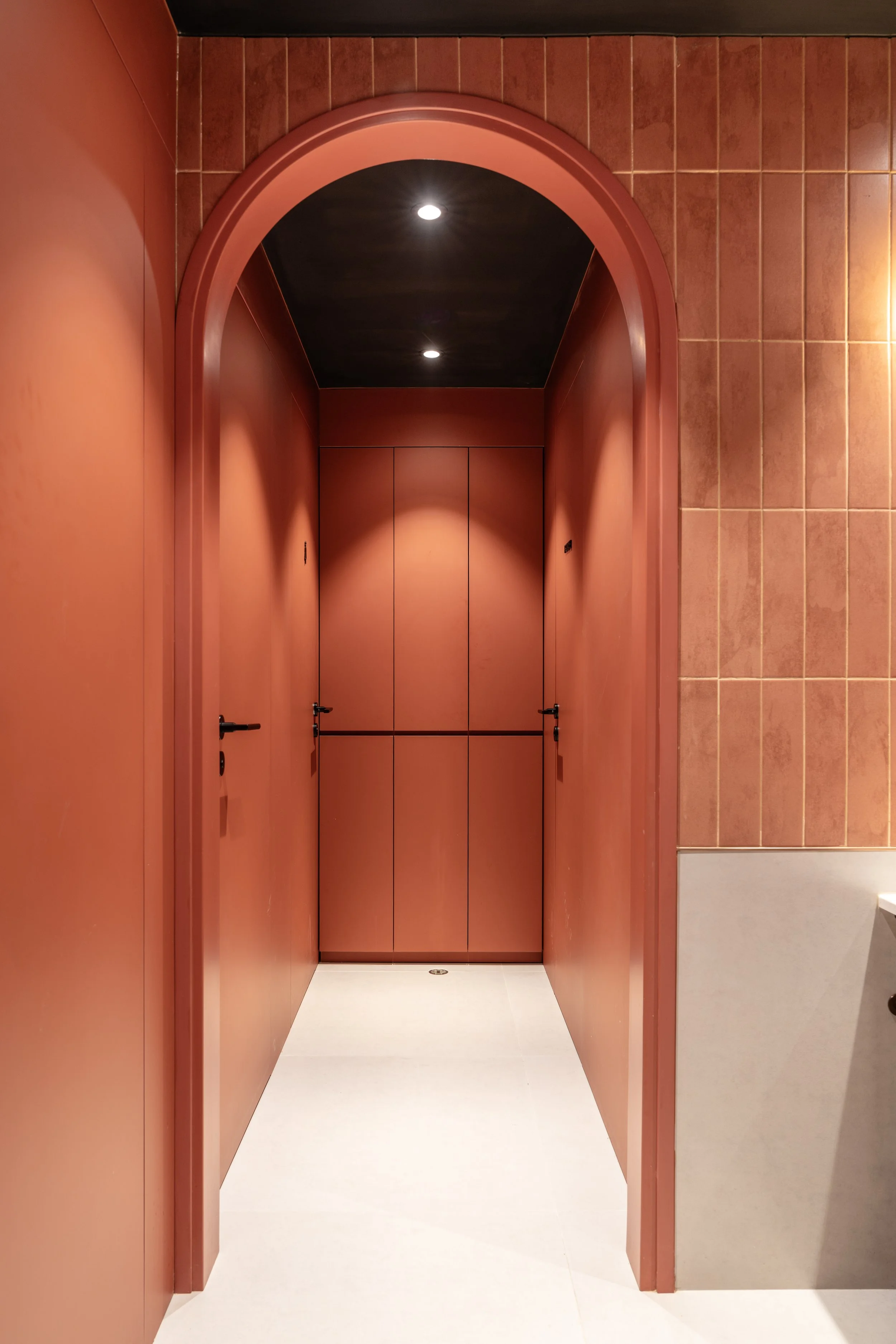 Curved arches, red terracotta plaster wall, and sculptural forms soften the space, while luxurious materials—cognac leather chairs, copper sinks, bronze accents, dark wood, and artisanal ceramics—deliver understated opulence. On the contrary, the common area using oak and wood materials with a cozy and modern different with meeting room.