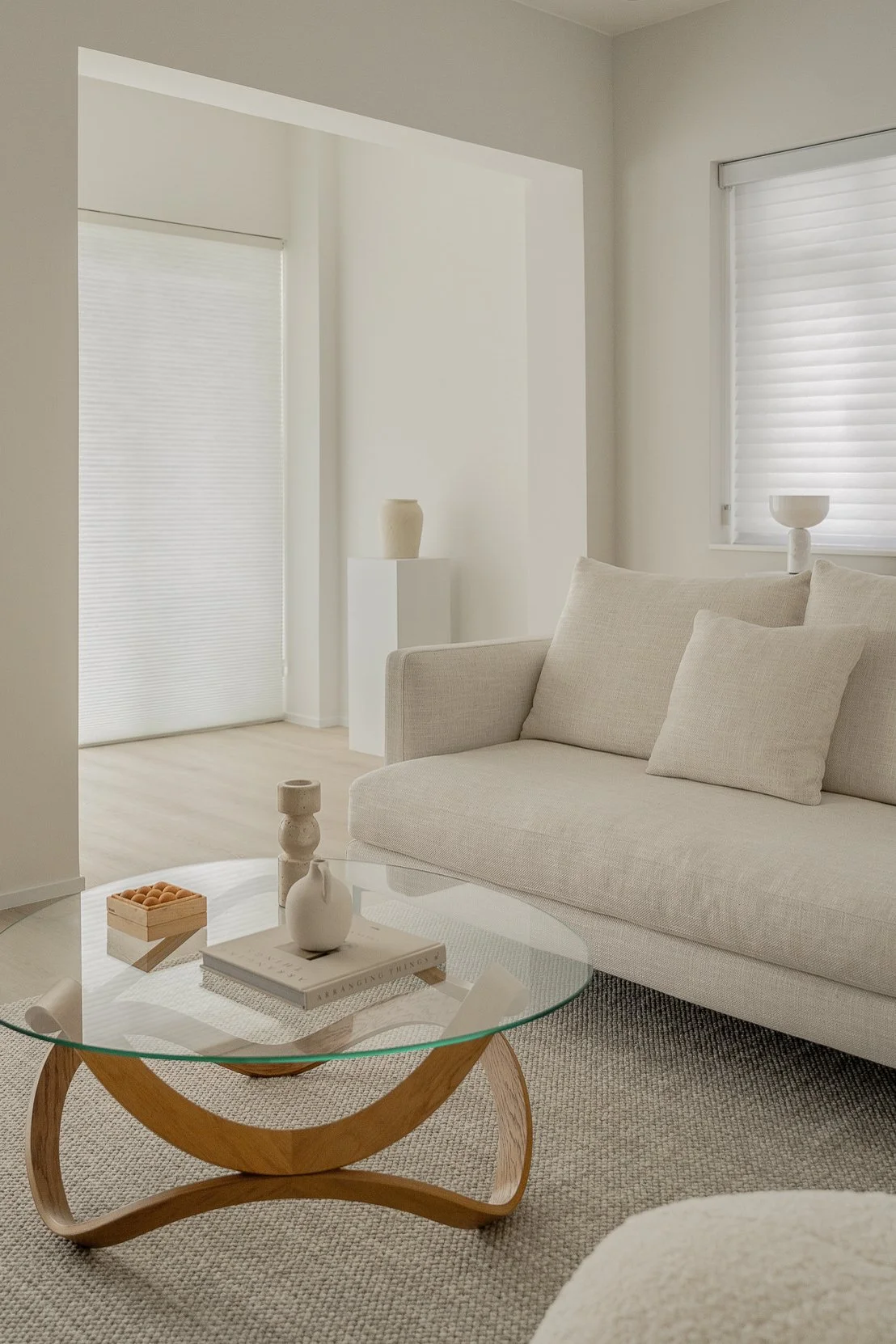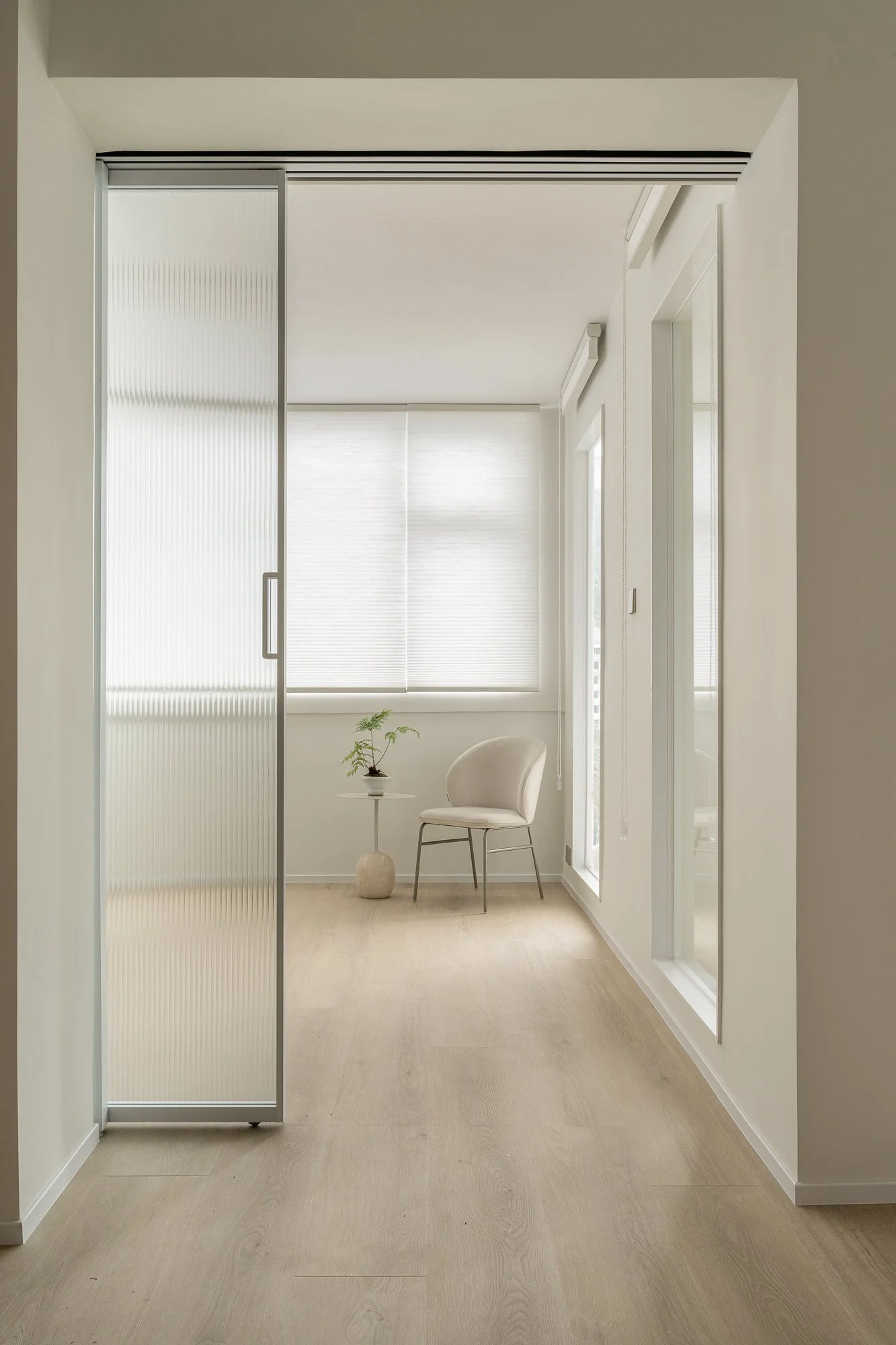 A glass sliding door connects the exercise space to the living room, allowing natural light to permeate the entire room and transforming the previously dark environment into one of openness and clarity. Bedrooms and bathrooms are predominantly finished in white, oak, and off-white tones to create a calm, understated atmosphere that promotes restful comfort for occupants.