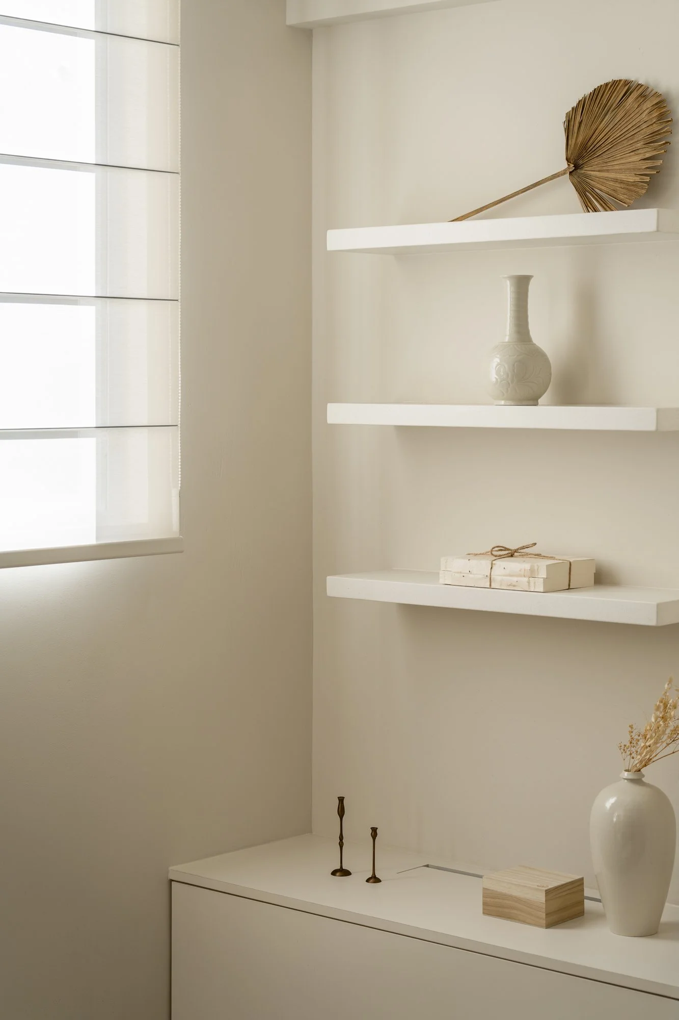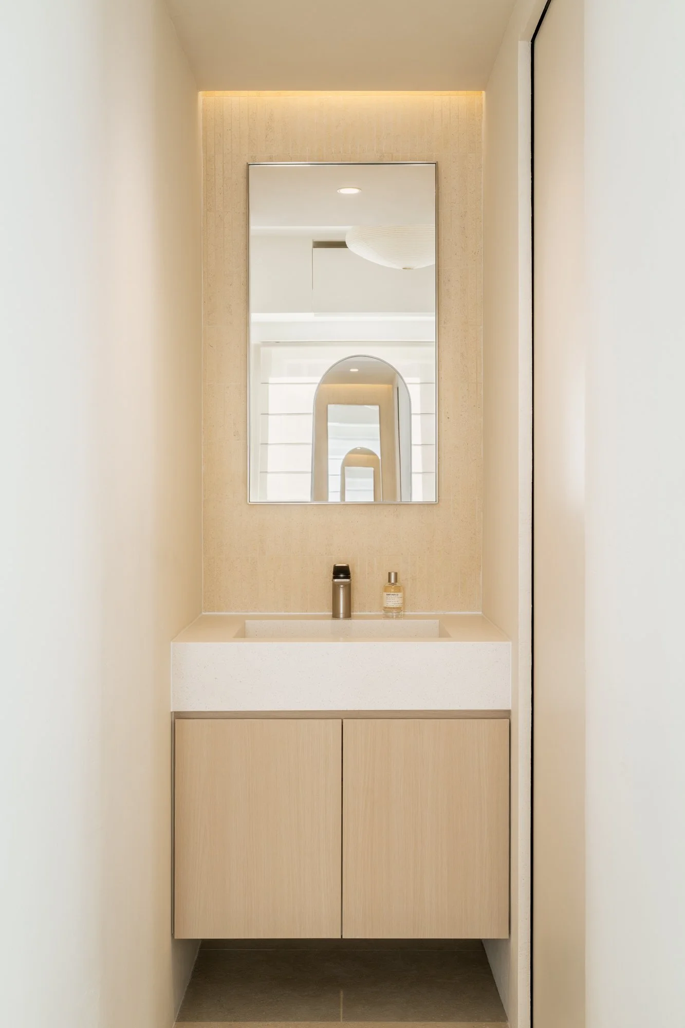 With the ambition of creating a restorative and effortless space with an understated character, we using the arched mirrors, curved walls, curved seating area.Also, adding the natural raw stone accents, textured linen curtains, dried botanicals, woven rattan elements depth without overwhelming the simplicity.Furniture, such as the plush gray upholstered styling chairs and integrated storage, prioritizes comfort and function, with thoughtful details like brass hardware and artisanal objects providing quiet luxury.