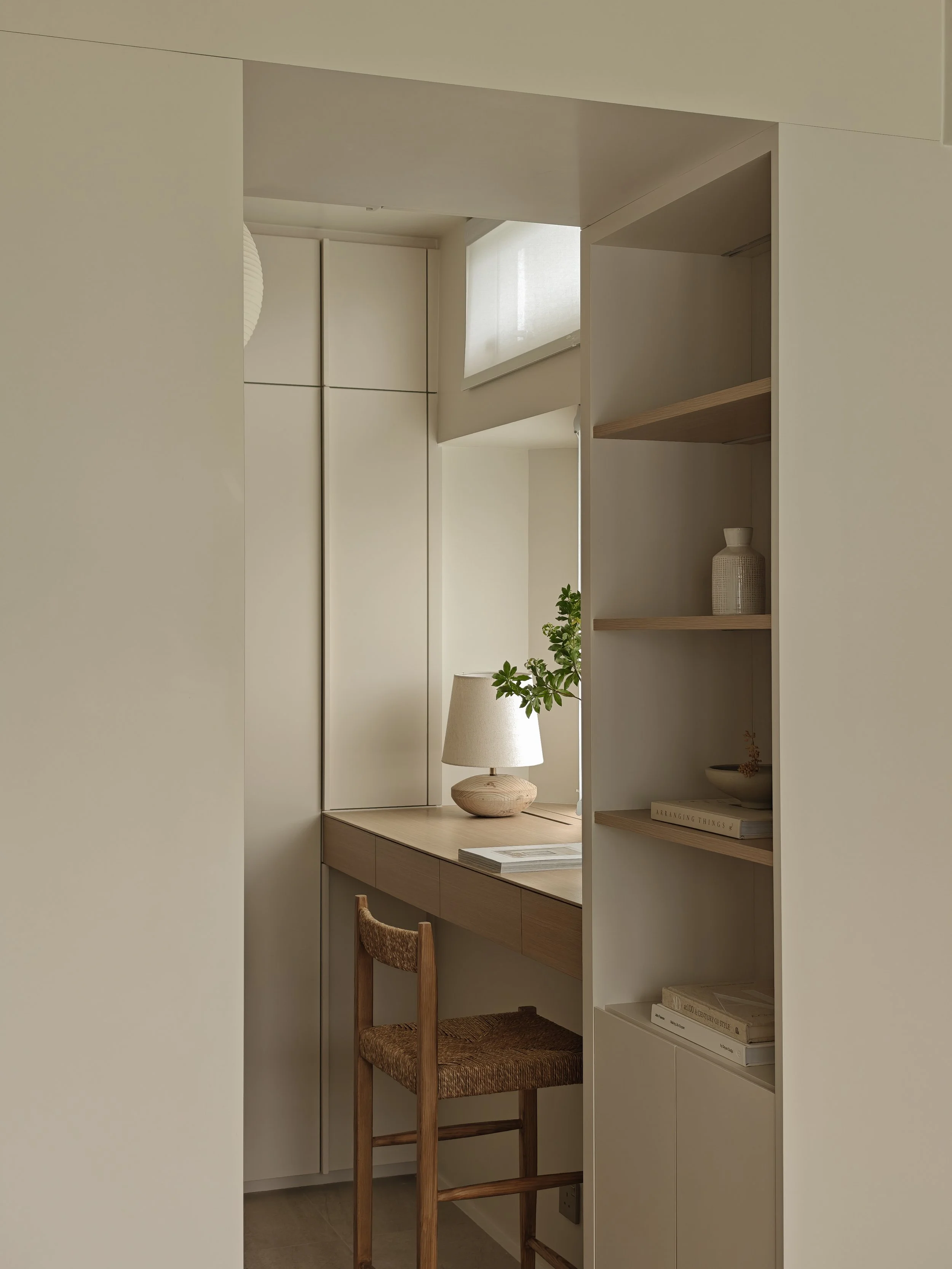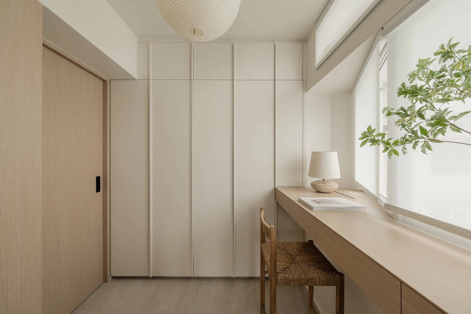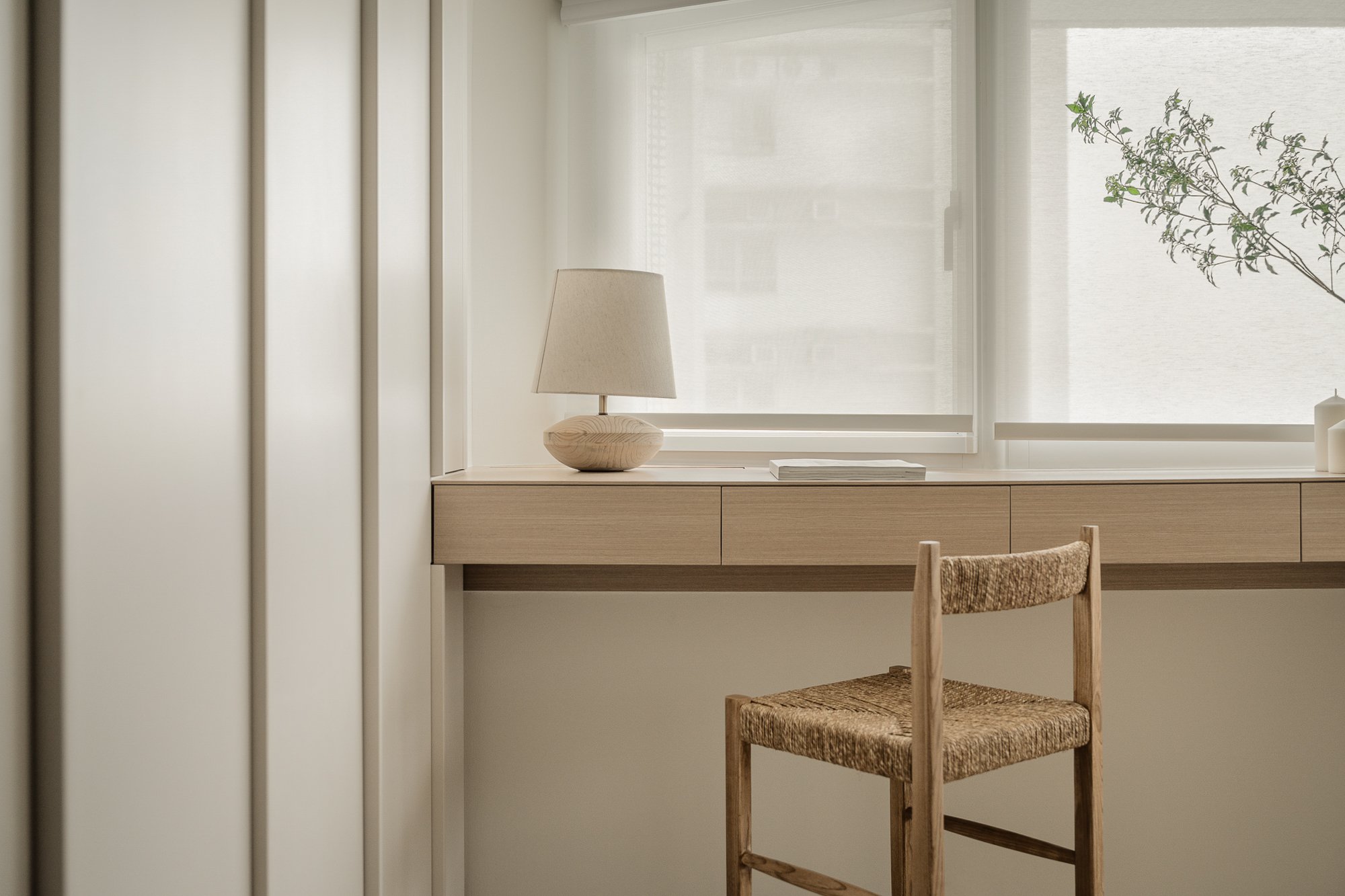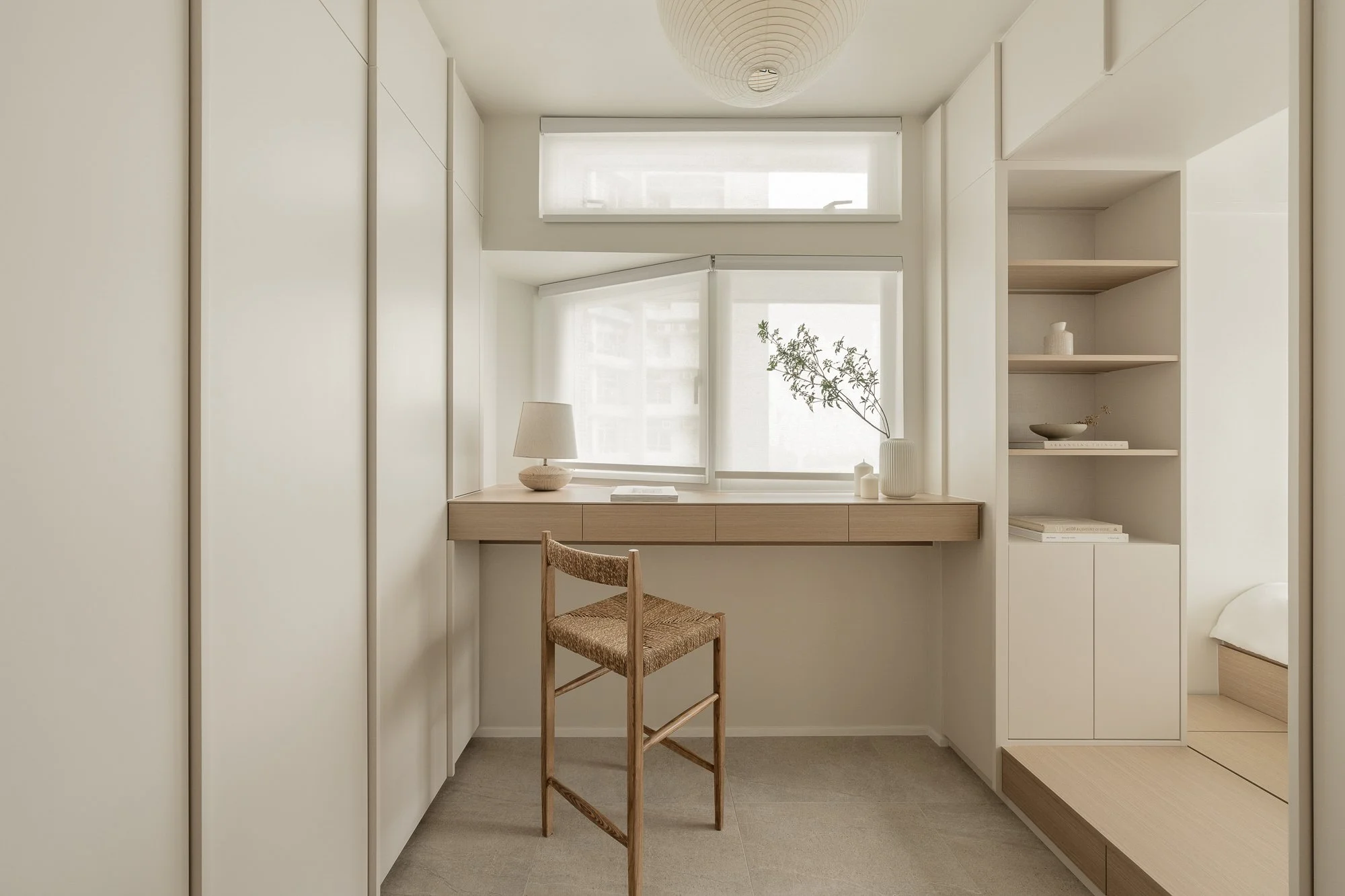 Hidden in a sun-drenched, narrow corner, the workspace perfectly embodies efficient design and poetic restraint. A wall-mounted desk, also crafted from warm-toned wood, extends to the window, where soft natural light fosters focused work. Storage space blends seamlessly with the architectural design, the desk becoming a platform for contemplation and meditation; the entire corner resembles a private, tranquil space for reflection or creation.