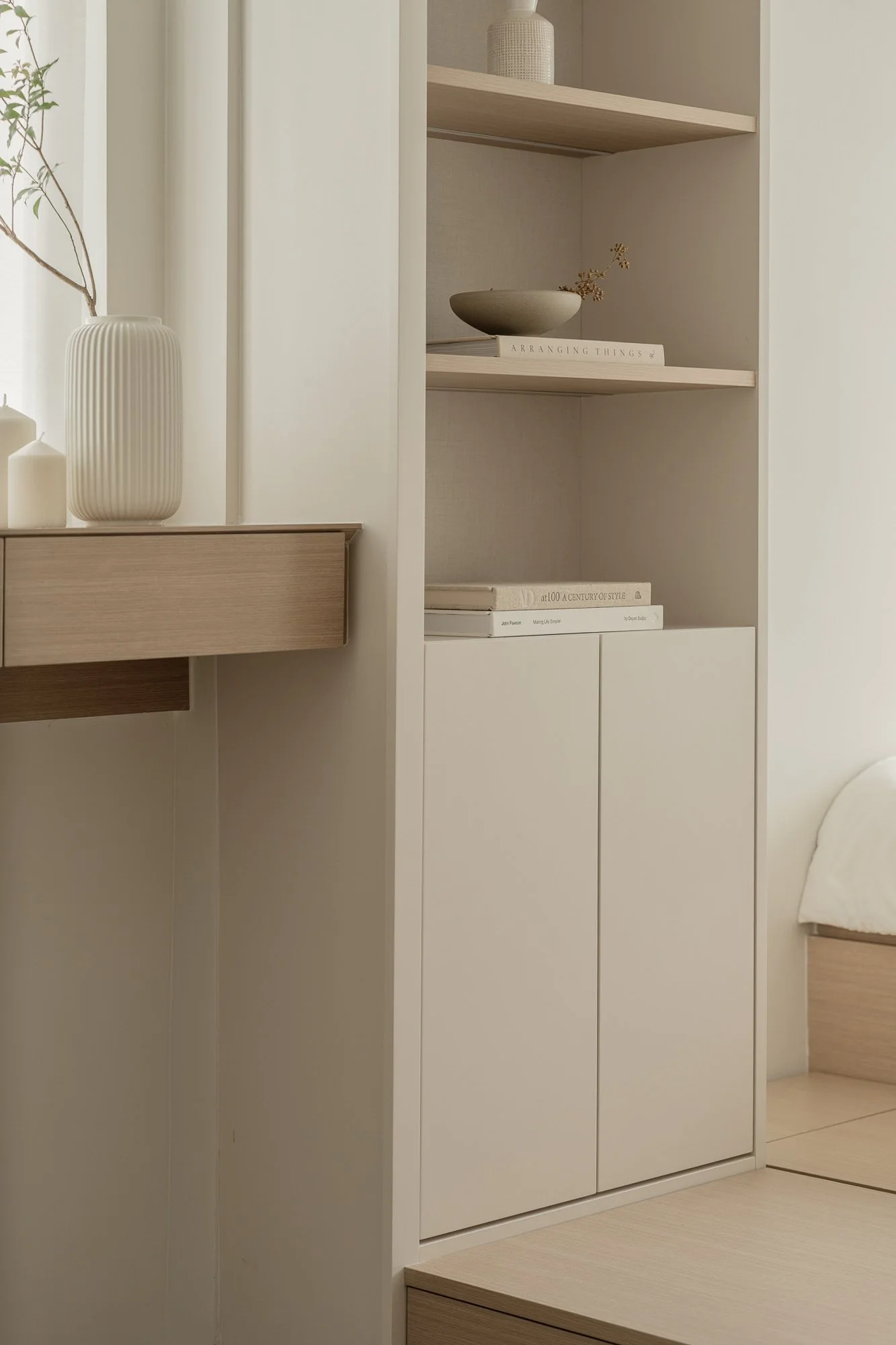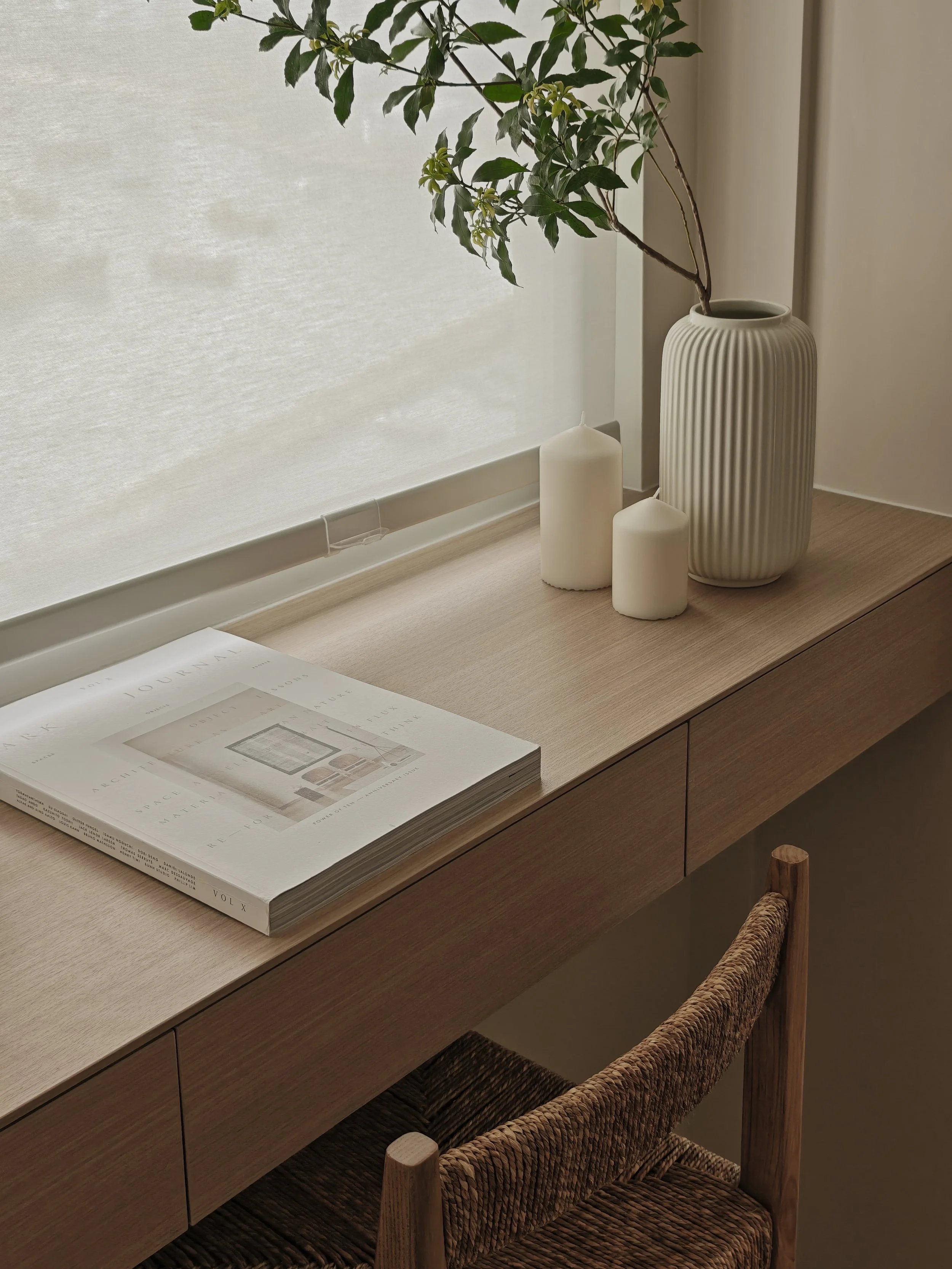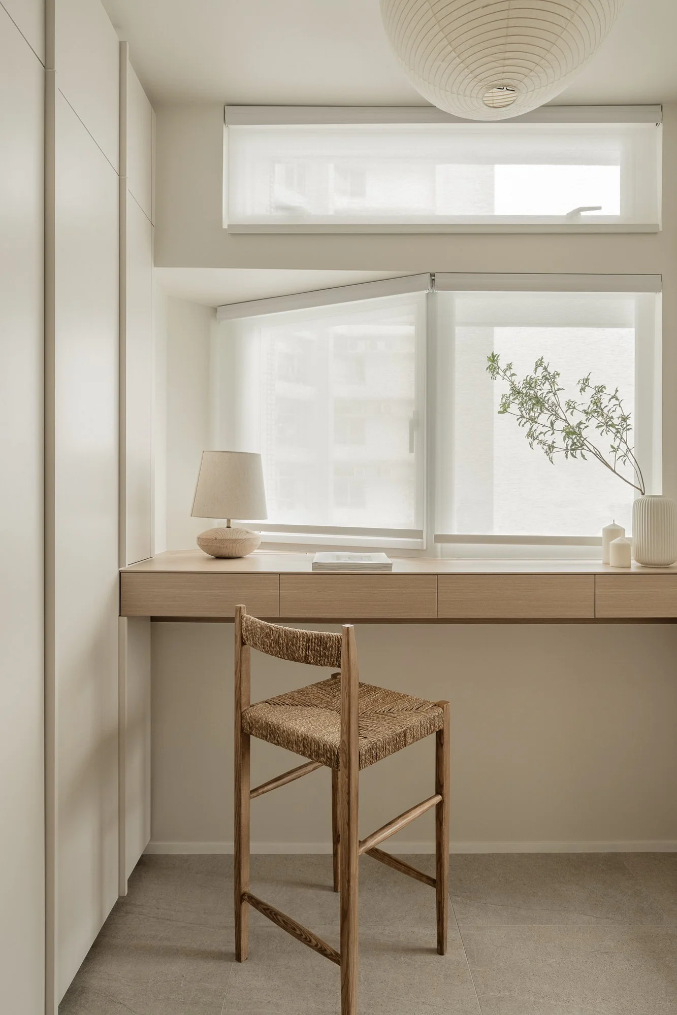 Hidden in a sun-drenched, narrow corner, the workspace perfectly embodies efficient design and poetic restraint. A wall-mounted desk, also crafted from warm-toned wood, extends to the window, where soft natural light fosters focused work. Storage space blends seamlessly with the architectural design, the desk becoming a platform for contemplation and meditation; the entire corner resembles a private, tranquil space for reflection or creation.