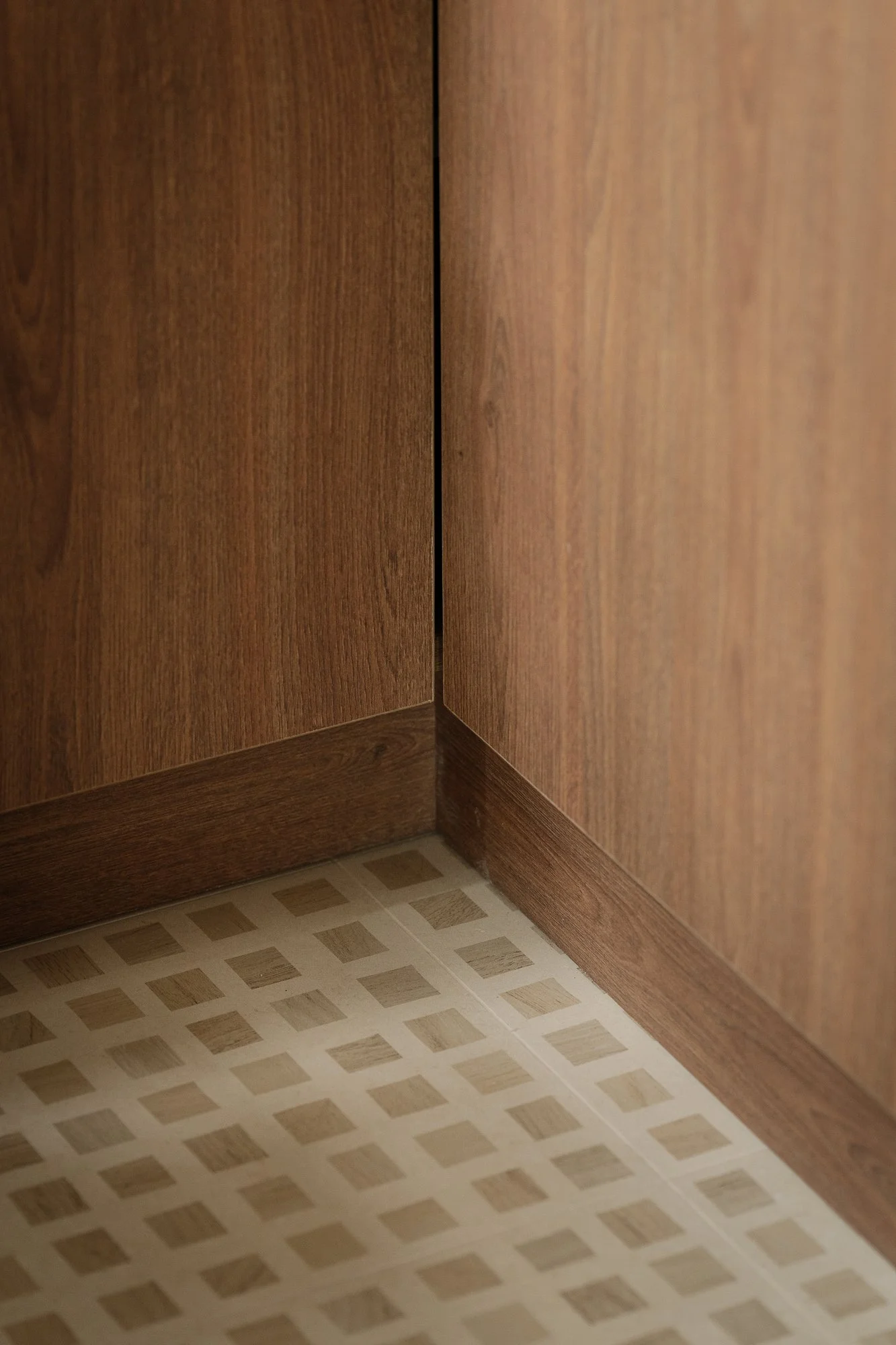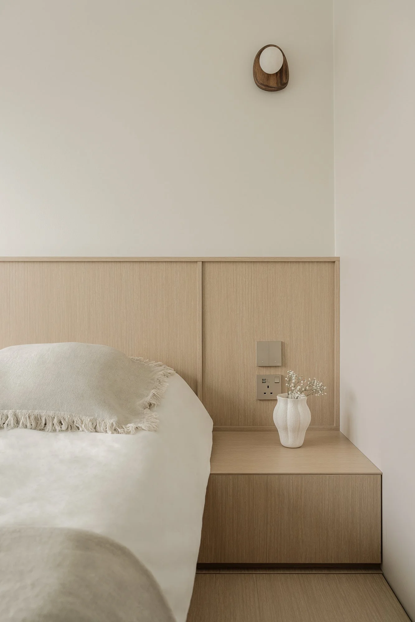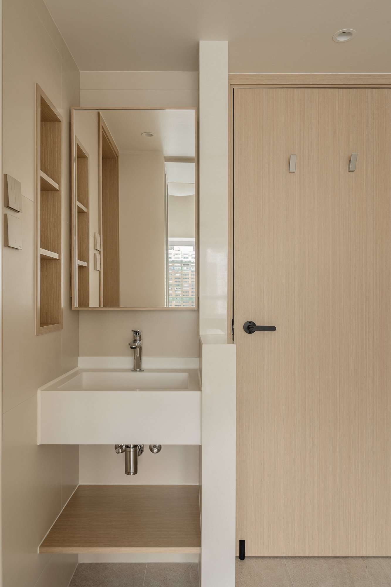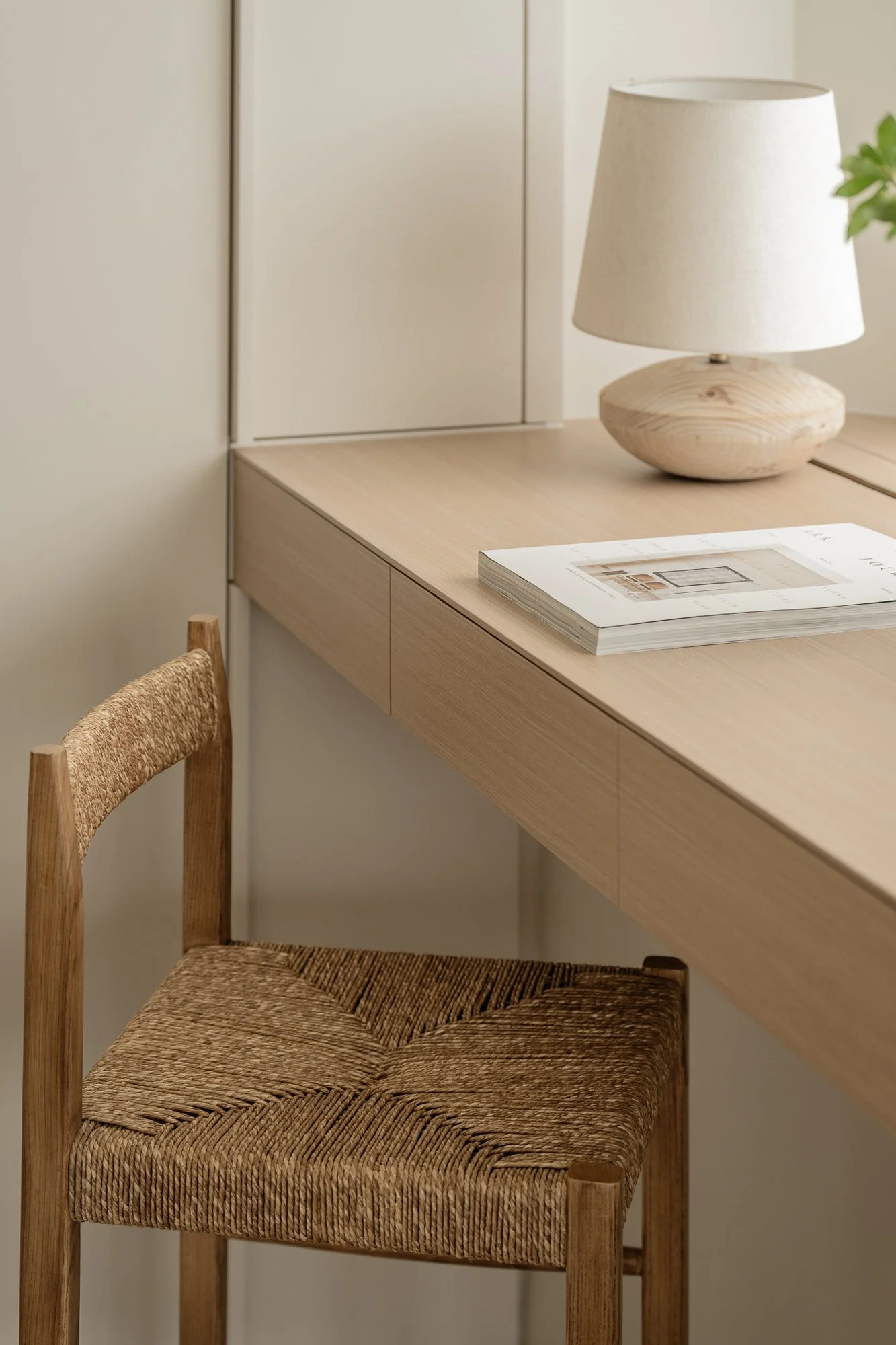 Hidden in a sun-drenched, narrow corner, the workspace perfectly embodies efficient design and poetic restraint. A wall-mounted desk, also crafted from warm-toned wood, extends to the window, where soft natural light fosters focused work. Storage space blends seamlessly with the architectural design, the desk becoming a platform for contemplation and meditation; the entire corner resembles a private, tranquil space for reflection or creation.
