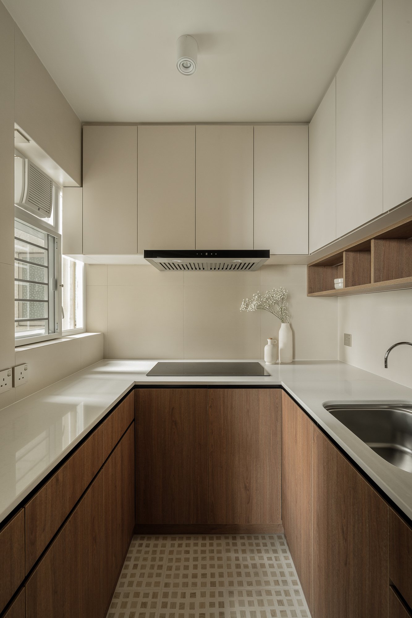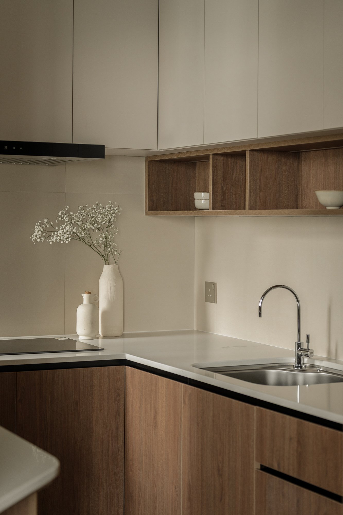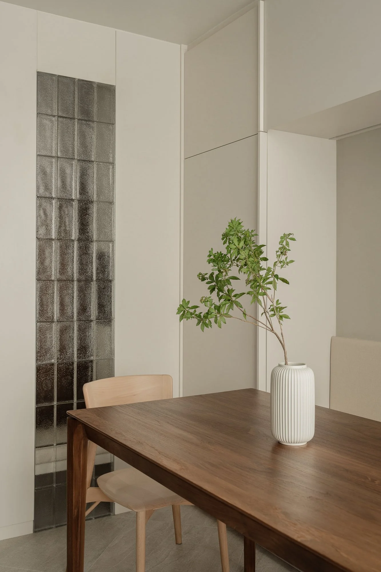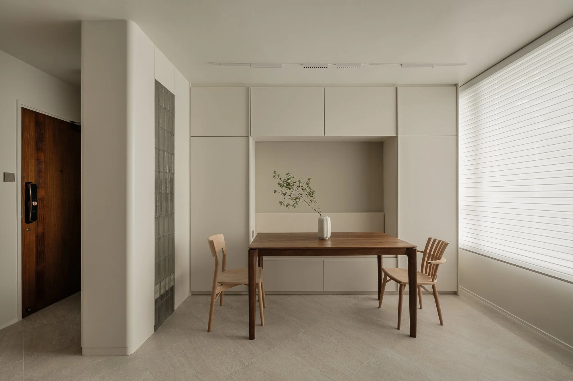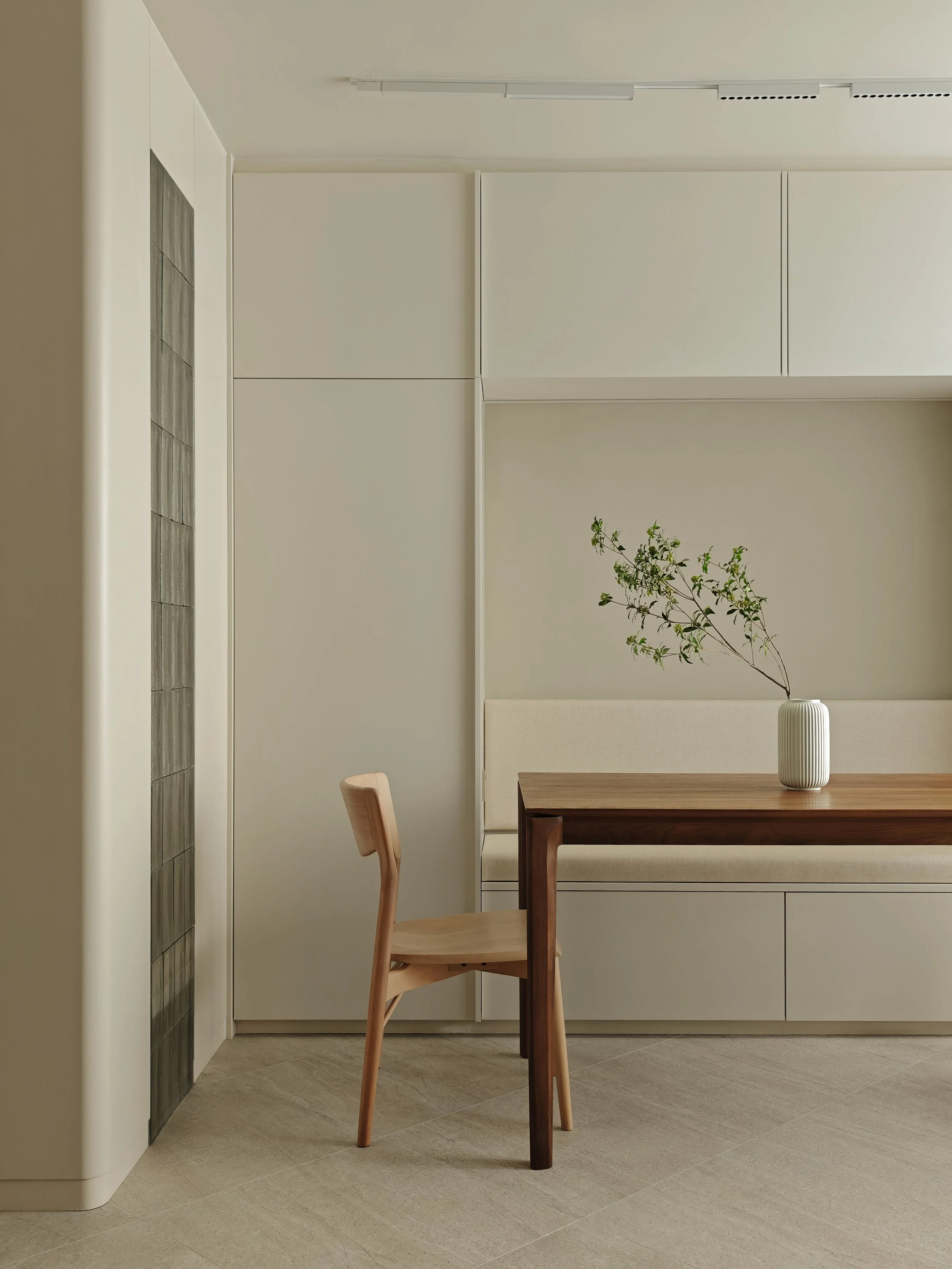 The design of this residence incorporates Japanese Scandinavian style, creating a tranquil and introspective atmosphere: soft natural light floods the interior, creating a warm and even color palette of beige, taupe, and light linen.A sturdy walnut wood table sits in the dining area, its legs featuring clean, flowing lines that taper slightly, providing stability to the space. The natural grain of the walnut wood subtly contrasts with the surrounding soft, matte beige cabinetry. This corner is pleasing to the eye: simple, practical, and reassuringly peaceful.