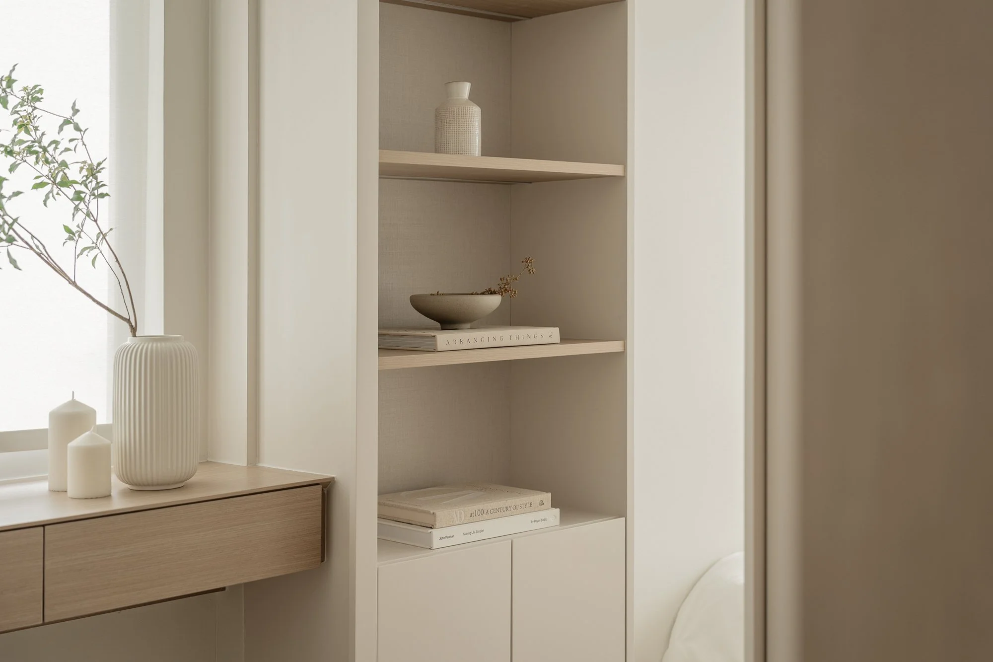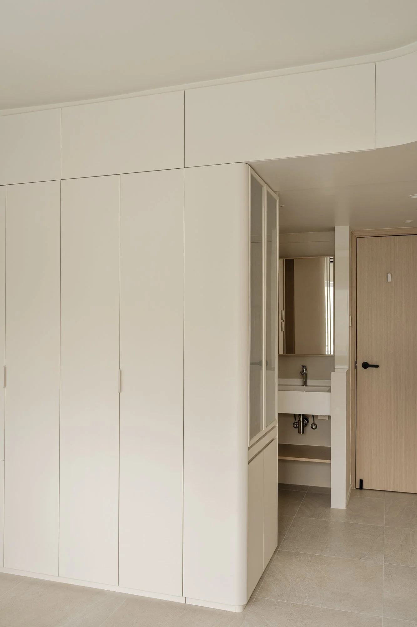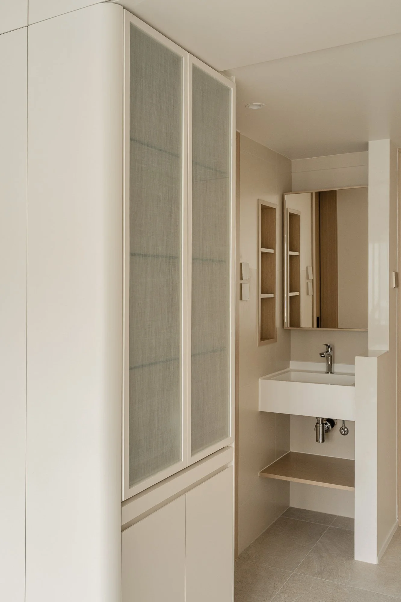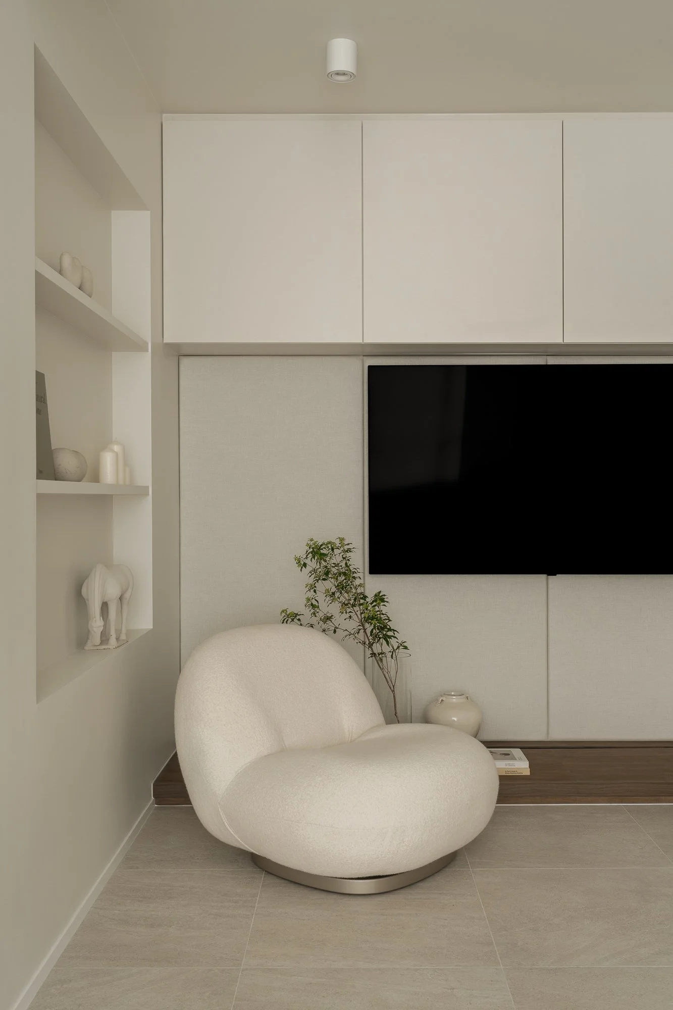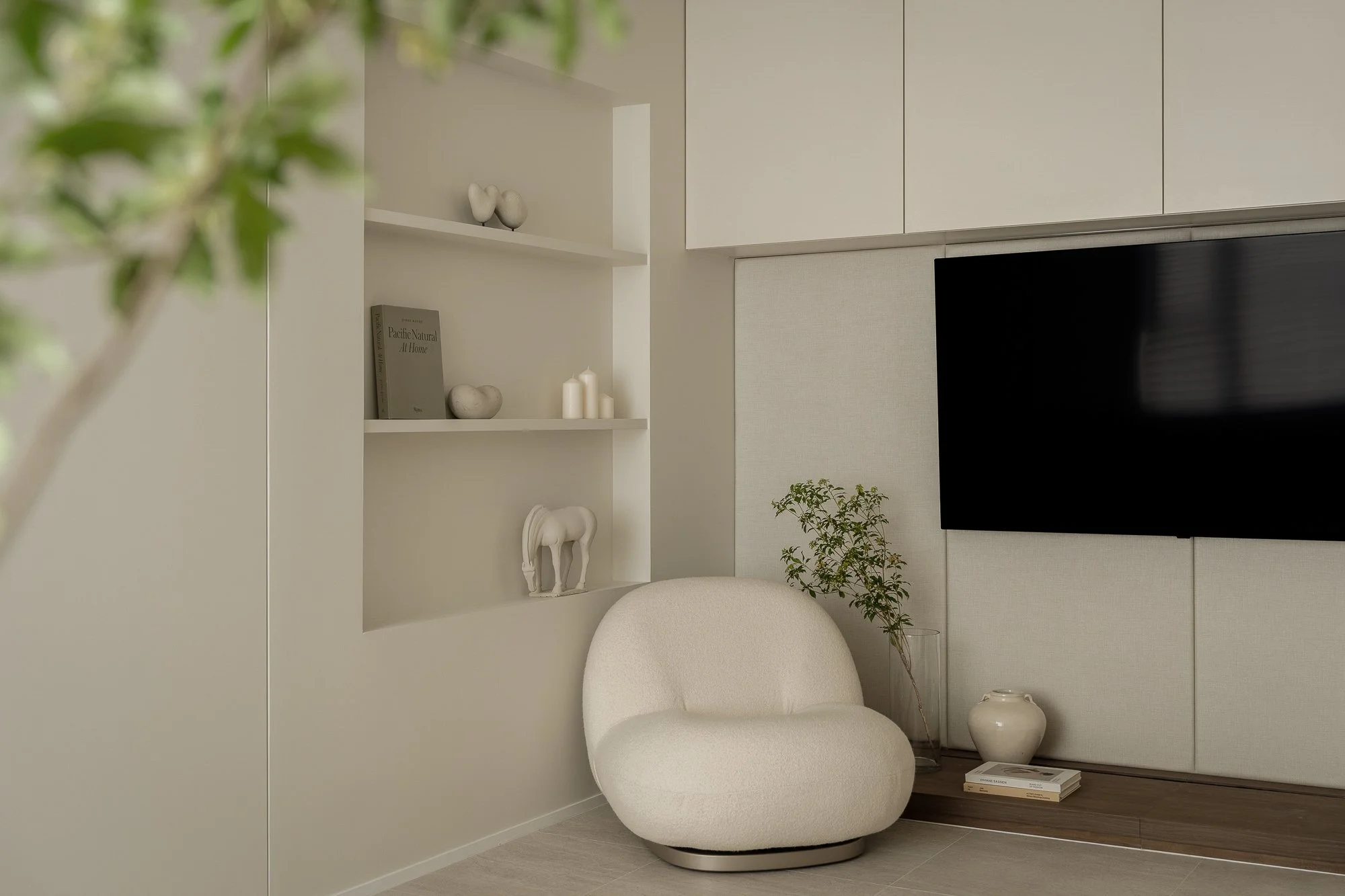 Stepping into the adjacent living space, you are greeted by an exquisite and comfortable retreat. Custom-made cabinetry, extending from floor to ceiling, uses warm neutral tones and cleverly integrates audio-visual equipment and storage space. Open niches provide space for displaying items, creating a tranquil and peaceful atmosphere.